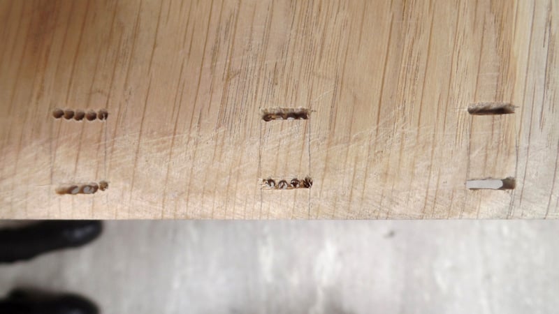 They were sewn over cords made of vegetable fiber or leather strips, which are then laced through holes in the boards. With cords, you can just drill holes to lace them through, but you need slots for leather thongs. I drilled a series of holes and filed out the area between them, then chiseled out channels for the thongs to lie in, which keeps them from being too prominent on the board after it is covered.
