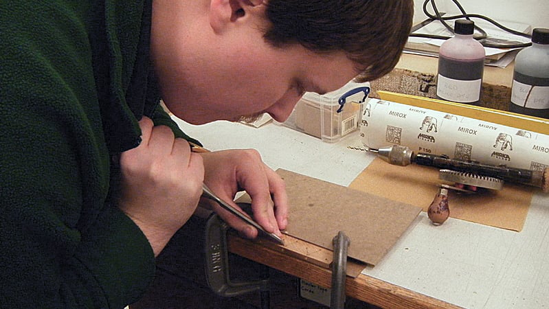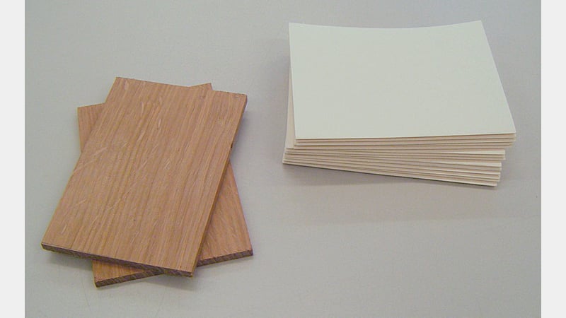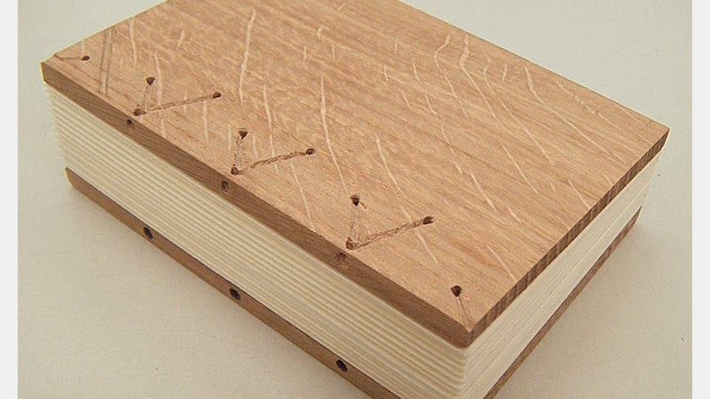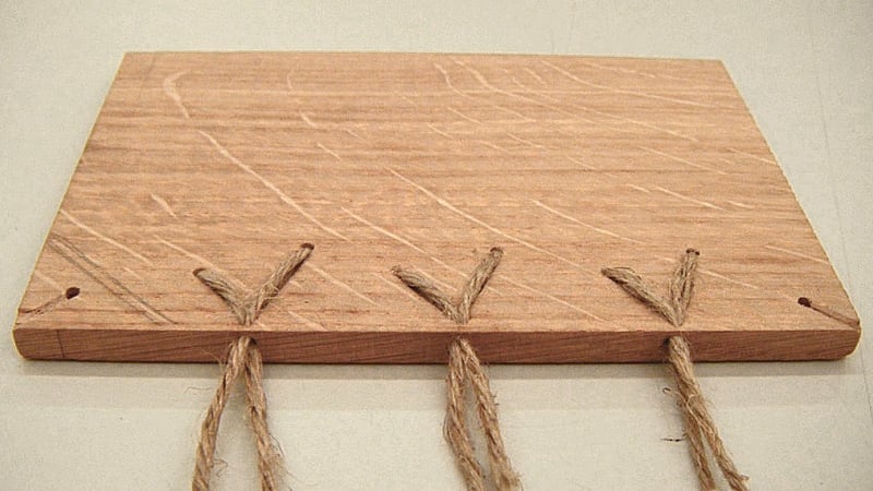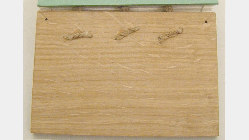 Whilst original Carolingian books would have been written on parchment, paper was used for the model, and it had been kindly pre-cut and folded for us. The boards were oak, one of several woods which may have been used on Carolingians, others being beech or poplar. Ideally, whatever wood is used for boards, it should be quarter-sawn to reduce the risk of warping, as the tree-rings run across the thickness of the board, rather than along its length.