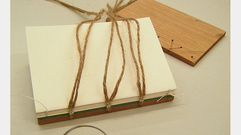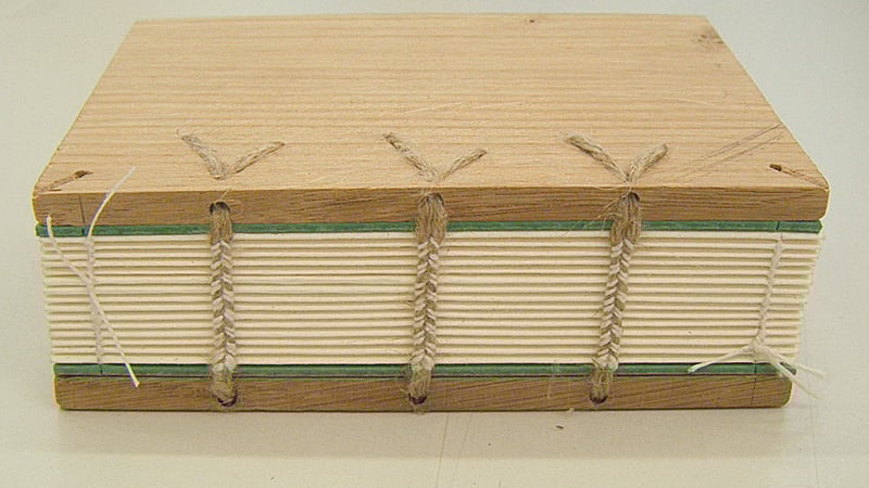 Next, I sewed the sections to the cord supports using a herringbone stitch. I left the green waste board in during sewing, as the covering leather would be fairly thick and so extra space would be needed between the board and the textblock.