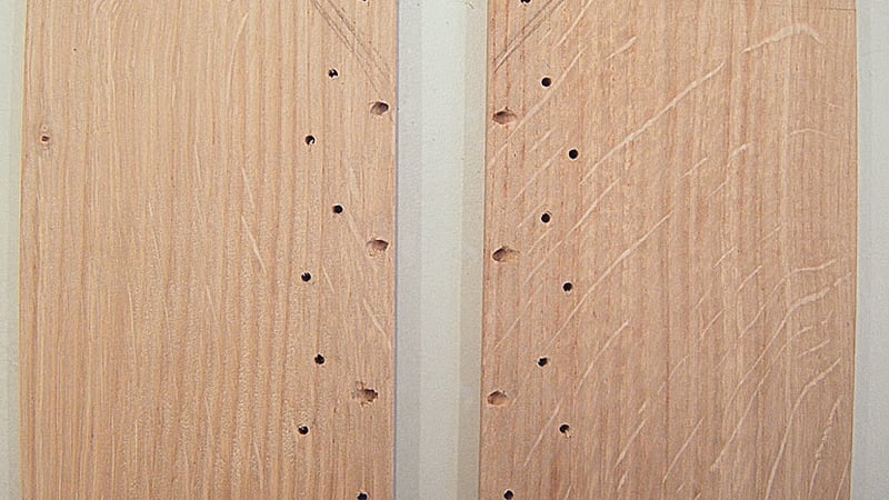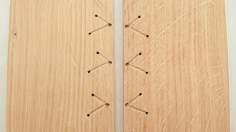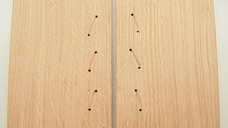 Then two points were marked a short distance from each exit hole, at diagonals to create a V shape. Care is taken to make sure these points don't all line up with each other along the length as when these points are then drilled, a line of holes would create a weakness in the board, much as a perforated sheet of paper is easier to tear along that line. Another two points are marked diagonally in from the corners. Once these had been drilled, with a smaller 2 mm drill bit, and the same process repeated on the second board (but in mirror image), the two boards looked like this: