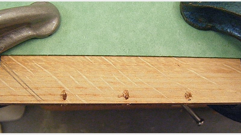 The first step was to drill holes in the edges of the boards for the sewing supports. These holes enter the board in the middle of the edge and travel diagonally towards the outer surface of the board. For this I used a hand drill with a 3 mm drill bit, making the hole just large enough to take two cord supports. Three of these were drilled, spaced as seen below.