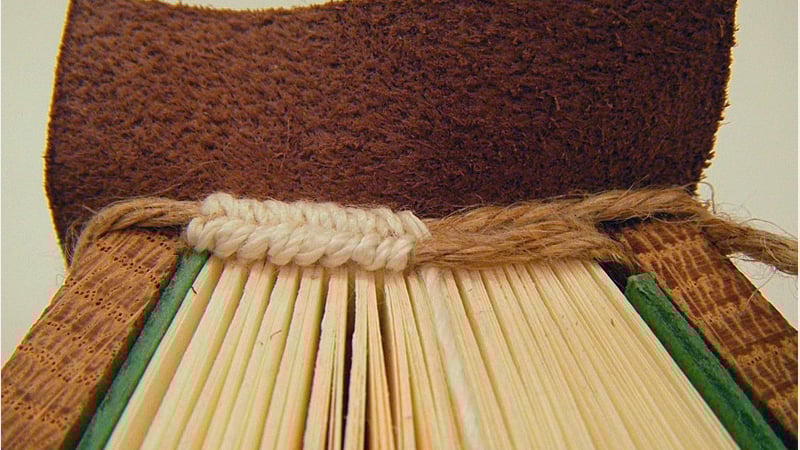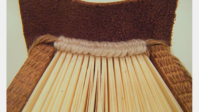 Before covering, the same leather is used to line the spine between the cord supports, and these linings and the tab are trimmed to the width of the spine. As a cutaway model, my binding only has the top half lined.