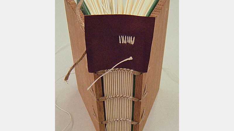 For the endband itself, I used packed herringbone sewing. The core was a linen cord, looped through the front board and tied into the back board, at the holes in the corners, to form a double support. The tied cord is not glued in until after sewing.