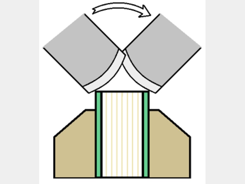 The cover is then measured and cut to provide a relatively large turn in, and to allow the spine covering to form the back of the endband tab (rather than turning the spine in as well). Bear in mind the thickness of the boards when cutting the leather to turn in at the corners, simply cutting at a diagonal will either leave board exposed or have too much leather overlapping.