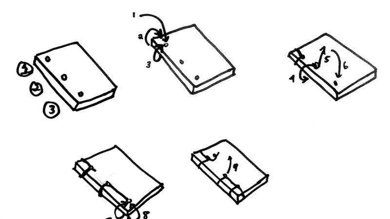 Wrap the thread around the left edge of the book and back up through the second hole. Take the thread from the second hole, through the third hole from the front to the back.