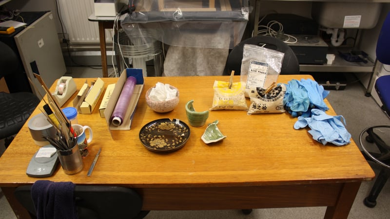 The procedure can be divided into three processes; bonding, filling and gilding. We started on the bonding process using urushi, first. Urushi adhesive was made by mixing urushi and rice powder, then the adhesive was applied to bond the shards. After bonding, the objects were put in a sealed box with a glass of water for 3 weeks. As the water evaporated, the inside of the box was kept humid. Urushi needs a specific humidity (75-85 percent) and temperature (25-30 degrees Centigrade) for a few weeks to dry.