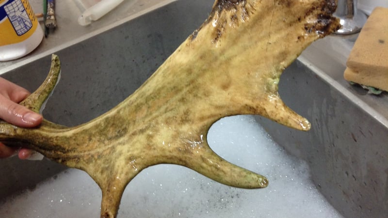 When the antler was cut open, we found that the solid useable bone was actually quite thin. Much of the inside of the antler was an open matrix of bone that would have to be cut away.