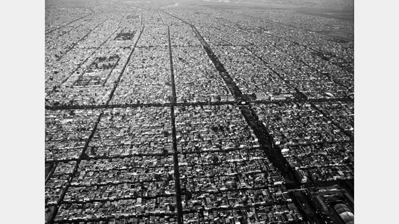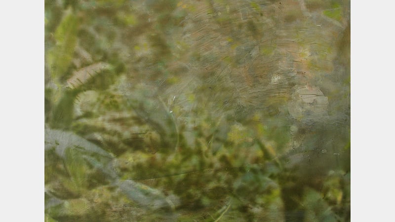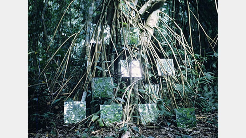 Of course it is not only figures of modernist painting that are referenced throughout Melanie's work. When, in Xilitla, fluorescent tubes appear amongst James's concrete forms, implanted like stakes within a copse of fluid buttresses, they recall the minimal installations of Dan Flavin. The appearance of various types of mirroring in the film, both literal and symbolically, is another careful reference. Images of symmetrical doubling, as well as its disruption (whether it be a pane of silvered glass being carried through the jungle or a close-up of a local man with severe strabismus) are conscious references to the work of Robert Smithson, particularly his series of Mirror Displacements in the Yucatan and elsewhere. Appeals to notions of the disruption of perception and the instability of the gaze are of course multilayered and are again fed back into painted imagery - various canvases appearing as if related to the eroded patina of silver bromide or a painted invocation of entropy. Melanie has made previous references to Smithson's work, most notably in her 2003 work Spiral City, another film made in collaboration with Ortega. By transposing the movement of Smithson's iconic Spiral Jetty - a constructed land mass curling into a salt lake in remote Utah - into the prescribed flight path of a helicopter flying above Mexico City, Smith created a striking portrait of the city that tilts and lurches like a slow tornado rising above the streets. The formal grid layout of the city is challenged by this disorienting spiral movement, expanding outward and dispersing (as opposed to Smithson concentrating movement inward), yet still capturing the chaotic, sprawling nature of the city from high altitude.