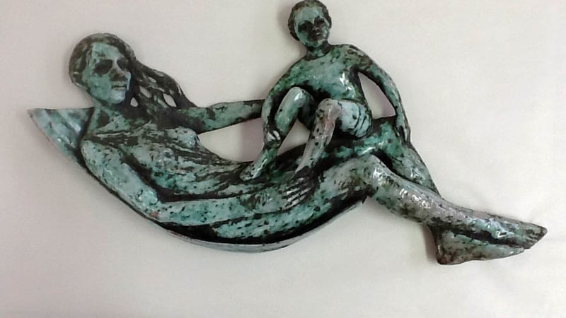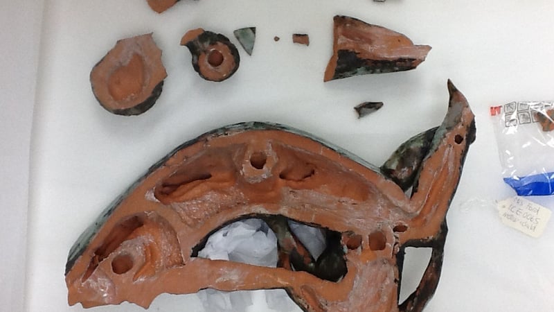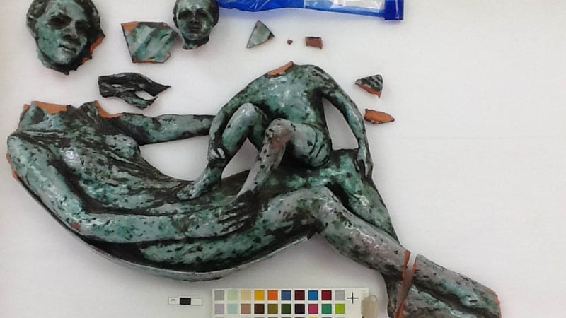 What is it? The broken object on my workbench; my first "live" project, was a modern, terracotta relief sculpture, Mother and Child, probably made in the 1970s or '80s by the Head of Art at St. Paul's School, in London. The owner was a student of the potter and cherishes this piece, holding as it does memories of happy days at school. It is heavily potted and covered in semi-translucent green and white glazes. Raku-style firing created pockets of black encrustation in the crevices and highly textured portions of the sculpture, such as the hair and heads of the joined figures. The Damage The sculpture was recently broken when a plaster cornice fell from the ceiling. Both heads were broken off at the necks and along the woman's hair, where it met her shoulder. Her feet, at the end of the piece, were broken off, and the wing-like cape was shattered, with around 25 fragments having come from an area of around 2 cm2. Made to rest flat against the wall, the heaviness of the sculpture places the thinner portions of it at some risk. On the workbench it needed to be carefully supported while being conserved.