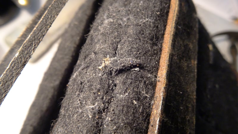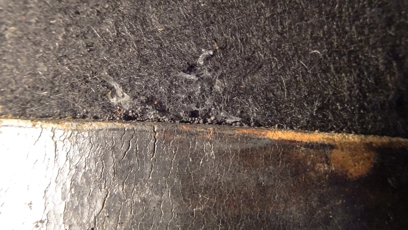 It was not difficult to find the evidence of moth activity-the moths in question were webbing clothes moths and case bearing moths. They thrive in the more dirty places of a uniform, and numerous holes could be found in the trouser turn-ups, armpits and the crotch area. The mannequin had been "holding" a water bottle with a felt cover. This had been seriously attacked and was riddled with holes. Apart from the holes, the moths' lives were documented vividly-frass (insect poo) was in abundance as were the "tiny fluffy sausages" (a technical term!) which are the moth larvae casings.