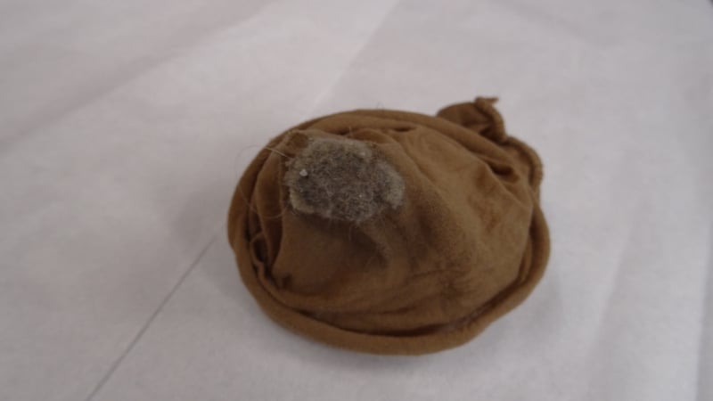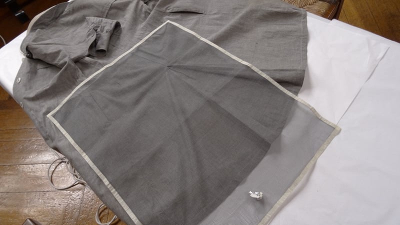There were several items the moths didn't munch on, most notably the girl's and nurse's dresses, which, being made out of cotton, were rather unpalatable to our wool-eating friends. If a uniform is stable enough, as these were, it can be surfaced cleaned. I did this with a vacuum cleaner. I tied a piece of stocking over the end of the nozzle and cleaned at an angle over a mesh reducing the risk of tearing material and losing any of the original object. It is important not to pass over with the vacuum more than once, as this could lead to damage. Although it was not visibly effective on the dress itself, this picture (below, right) shows just how much dirt and dust was collected!