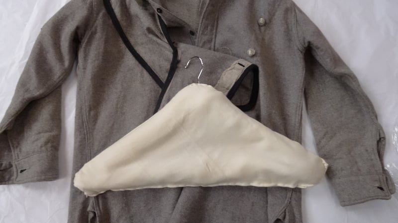 It is important to be able to store the uniforms safely. I wrapped wooden hangers with polyester wadding, padding them out so they would support the item sufficiently. I then sewed them a case from unbleached downproof.