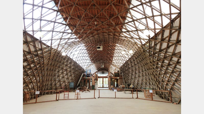The Museum was founded in 1970 on land offered by the Edward James Foundation in the interest of conserving buildings and techniques that would otherwise be lost. James' intention of establishing a college for the preservation of art and craft techniques was here extended, with the present-day museum standing as a further example of his scope and vision. The Gridshell itself weaves together the history of the museum with its current activities and is a fine example of architecture that speaks for the ethos of a place and encapsulates past and present activity as well as foregrounding the future. Designed by Edward Cullinans Architects (now Cullinan Studios), working with Bruo Happold engineers, and constructed by The Green Oak Carpentry Company, the building was the first major timber-framed diagrid to be constructed in the UK. Those familiar with the architecture of Sir Norman Foster will be able to envisage the steel diagrid of 30 St. Mary Axe (more commonly known as the "Gherkin") or the Great Court at the British Museum. What is striking about the Jerwood Gridshell, however, is the undulation of the frame, inspired by the landscape of the South Downs, and the smell of timber as you enter. The main frame is constructed from numerous 50-metre lengths of oak, made up of 35x50mm laths bonded with finger joints. The oak, which was imported from France, was laid out flat like a trellis and tensioned at various point and to varying degrees (with a scaffold and hydraulic system) allowing it to be pulled into position over an eight-week period. The Green Oak Carpentry Company designed the newly patented "node clamp" by which to hold the structure in position, allowing the timber to be manipulated, and creating flexibility for natural adjustments during its first year. The external cladding was cut from local Red Cedar, which has faded over the years. During its first few months the colour was so rich and so prominent in the landscape that the Gridshell was nicknamed the 'Ginger Peanut', but as the colour of the cladding faded the Gridshell relaxed into its environment. The undulating design, together with the light structure and natural materials, provide the Weald and Downland Museum with a piece of innovative and iconic contemporary architecture that blends seamlessly into the grounds.