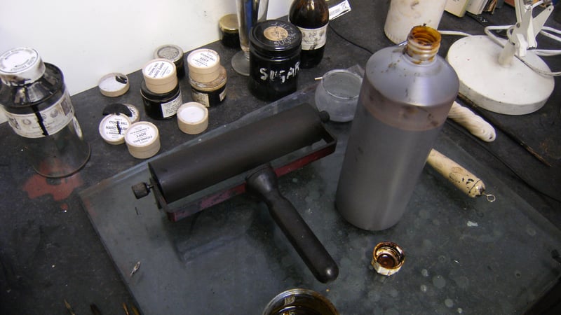 Finished with our images, it was time to bite the plates. Biting means to allow the plates to sit in an acid bath and let the acid eat away or bite the exposed copper, leaving the metal covered in the resist alone. The acid we used is ferric chloride, and provides a cleaner bite than other, more traditional acids. Once the plates were bitten, we removed the rest of the resist with white spirits prior to preparing the plates for printing.