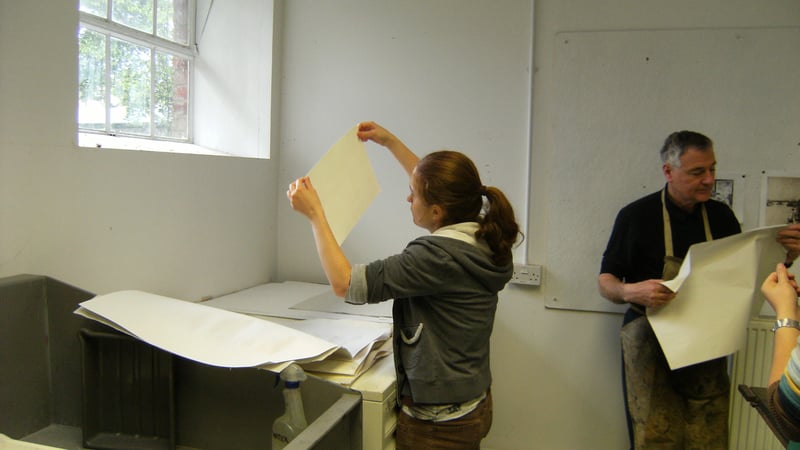 As I said earlier, the paper is wet when printing to allow the paper to be pushed up into the etched lines of the image and pick up the ink. We soaked the paper while we inked our plates prior to printing. Once we were ready to print and the paper had soaked long enough, we pulled the sheets out and removed the excess moisture by placing the paper between blotters and applying pressure in sweeping motions with our hands. When the paper had a matte appearance instead of being shiny with water, we knew it was just wet enough to print.