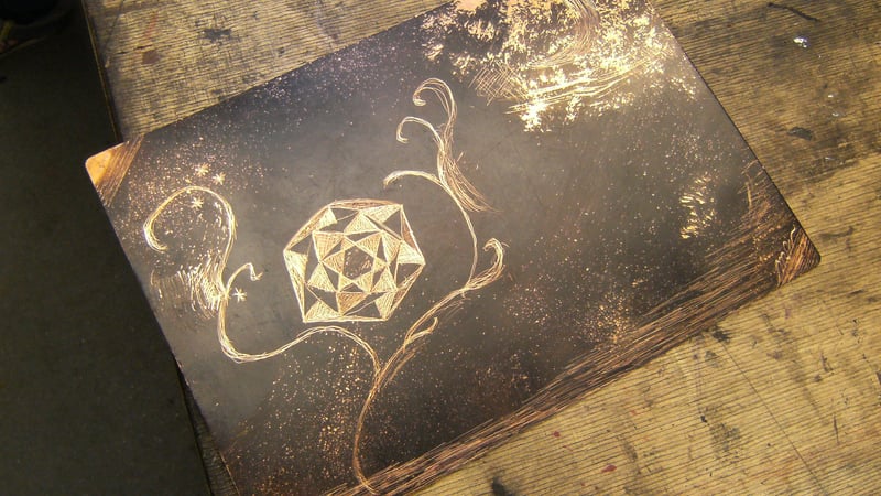 Since we only want a certain part of the copper plate to be removed by the acid, those areas that must remain un-etched are covered in what's called a resist, a wax-based material that is applied to the copper to form a ground, into which the image is drawn. We heated the plates slightly and applied the resist, then used a roller to get an even coating across the surface of the plate. It came out with only a slightly darker appearance due to the resist, so we smoked the resist to make more contrast between the ground and the drawing, which would make seeing our progress easier. To smoke the resist we lit a thick rope and held the plates overhead, allowing the smoke to deposit soot on the resist and darken it.