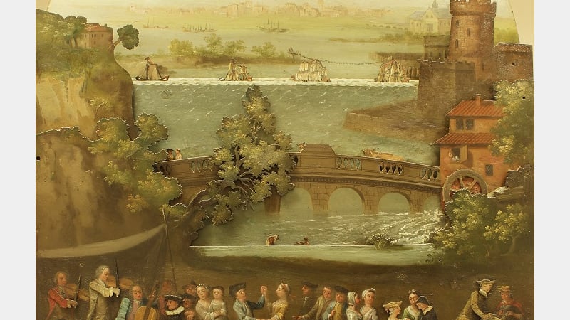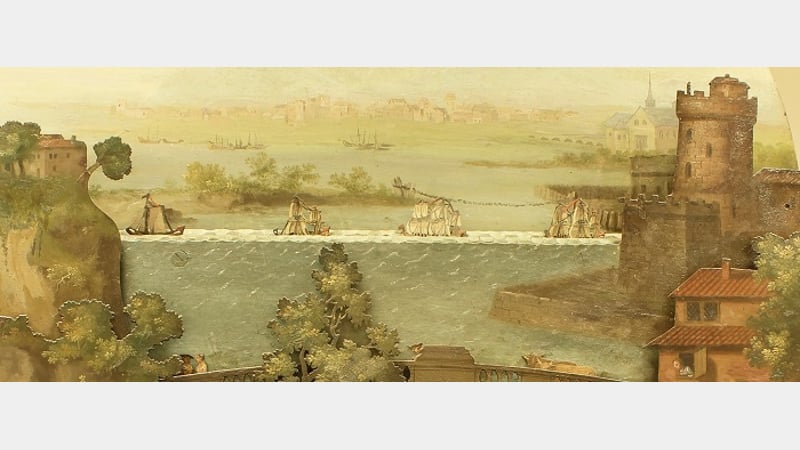 Questions can be asked such as: why place a classical scene in such a prominent place? What does this mean in the context of the painted scene of the period? Does the inclusion of fortification and the chain across the river on the painted dial refer to some significant historical event in the minds of people of the period?