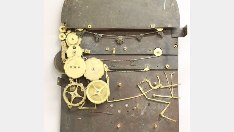 Looking behind the dial starts to reveal the secrets about how it all works. The organ movement drives most of the automata as it plays music. The train of gear wheels and levers on the left are driven from the lower right wheel by the organ movement gear train (not shown).