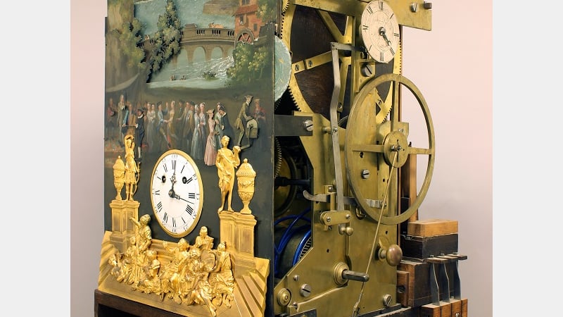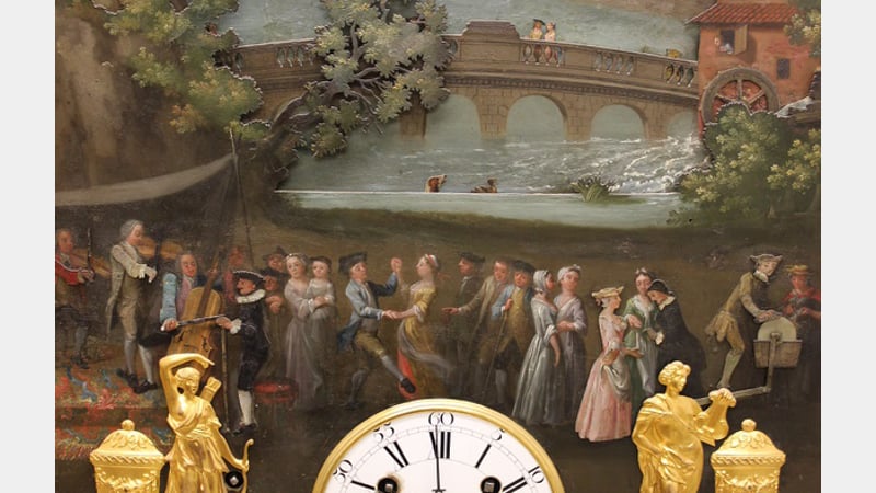 The Pyke organ clock has a multi-layered painted iron dial which shows a view of life in the eighteenth century. Rather than being just a decorated clock dial to show the hours or date, it is an extension of the organ movement. The dial has automata that are driven by the movement as the music plays. It was clearly designed to entertain; telling the time was a minor part of this clock's purpose.
