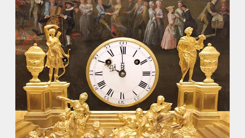 The classical scene is set against and contrasts with a painted eighteenth century scene. These two scenes frame the relatively small clock dial in the centre.