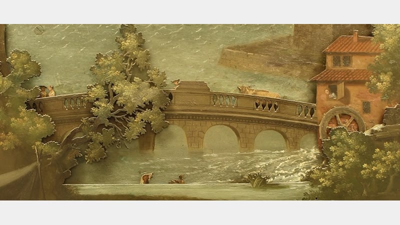 The second layer shows a bridge over a mill pond. The automata between the first and second layer is a dog chasing a duck across a pond. The mill wheel is automated as is the water through the mill race, to good effect.