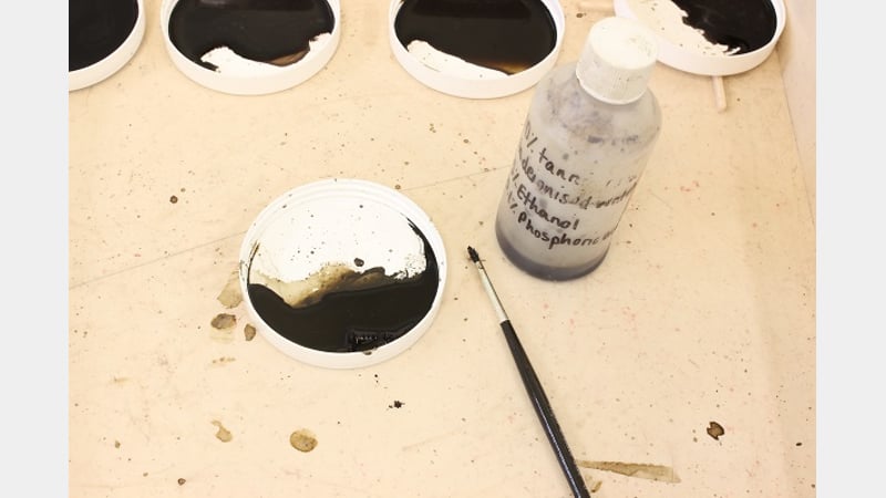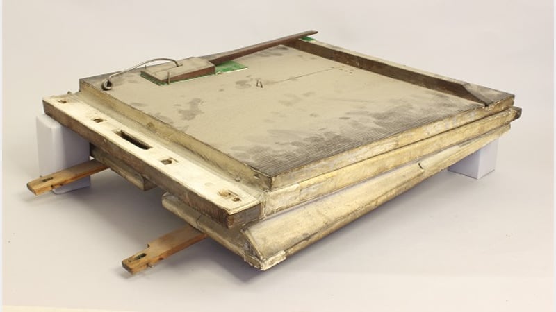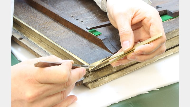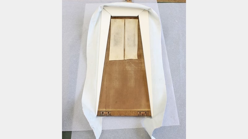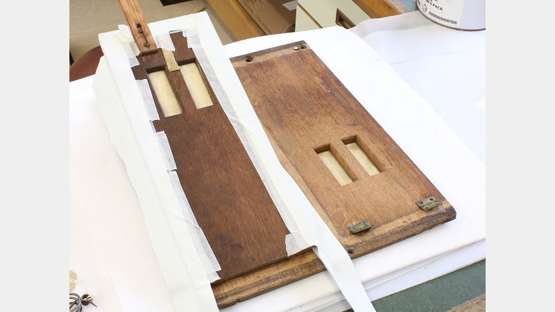 The strong bond of the glue was softened using Laponite. This gel like fluid was used as a poultice to re-introduce moisture to the glue, thereby enabling removal of the glue without damaging or having to refinish the edges of the bellows wood.