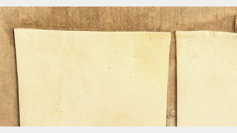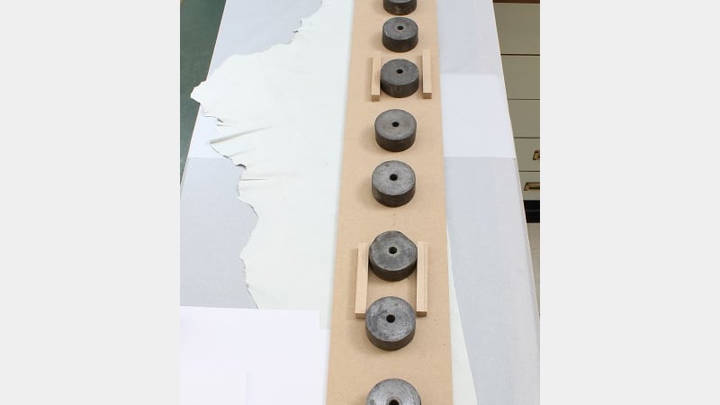 For bellows of this size the options were to either replace with alum tawed skin or "pneumatic" skin. Pneumatic skin or leather is a trade term for a modern tanned skin or leather widely used for air applications such as bellows. It was selected primarily because of the Lead Conservator Malcolm Archer's previous experience of using it on similar bellows.