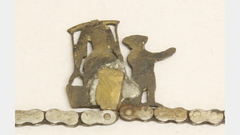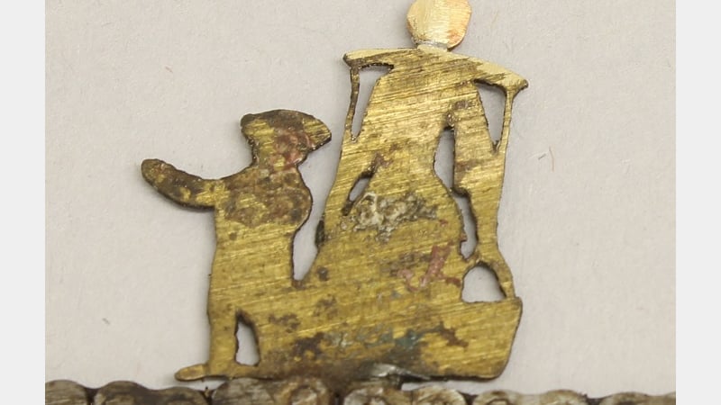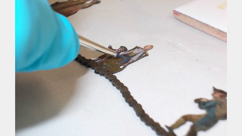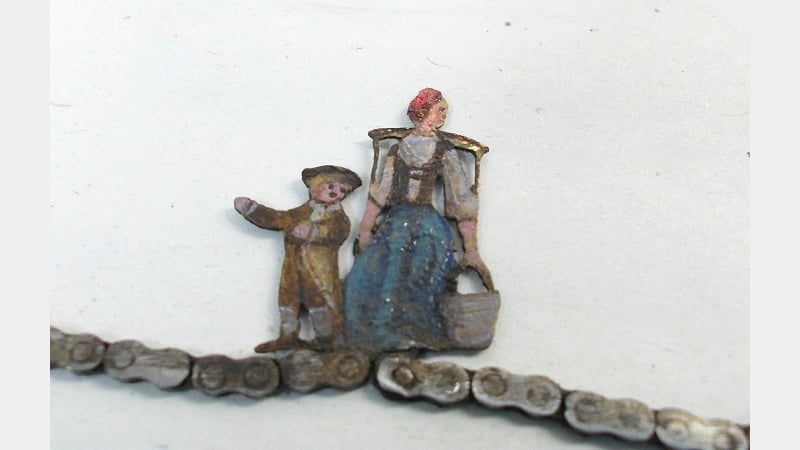 The most notable example are the milk maid and boy figures, which had obviously suffered some damage leading to the loss of the milkmaid's head. A soft solder repair had been made to reattach the figure to the driving chain. The heat applied during soldering destroyed the paint, leaving only traces.
