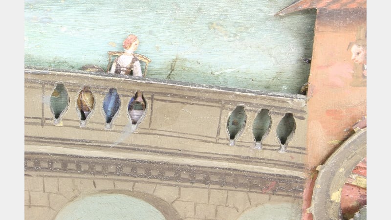 Given the age of the dial, its painted front surface was in overall good condition. There were very few losses to the paint, which was protected by a clear shellac. The colours were still vivid enough to present a vibrant scene.