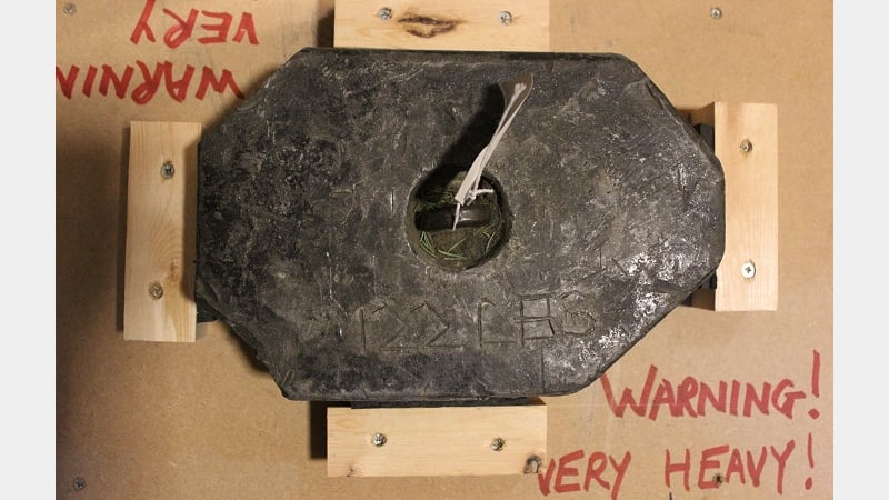 As was mentioned in a previous Pyke clock post Identifying the Music, some years ago a very heavy weight-122lbs (55kg)-had been substituted to run the Pyke clock's barrel organ. This was done to force the organ to work to overcome problems which would otherwise prevent it from working.