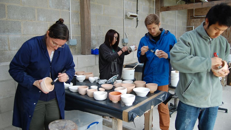 From the editor: Every summer pottery instructor Allison Sandeman runs a raku firing for the ceramics students and anyone else who's joined in over the year. They use wood and gas kilns and manipulate the environment of the pots during and immediately after firing to affect the glaze, though it remains a highly unpredictable alchemy. Despite a miserably rainy day at West Dean, glazing for this year's raku proceeded as planned. Our cameras all got passed around a bit but I think all of these were taken by Tomo, Mariko, Tiago, Rachel, and me. Rachel will take over from here: