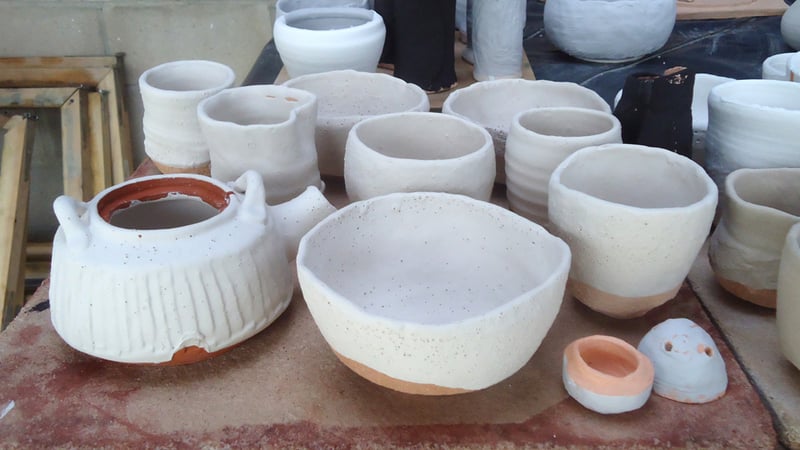Before glazing all the pots were biscuit fired in a standard kiln.