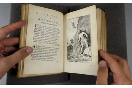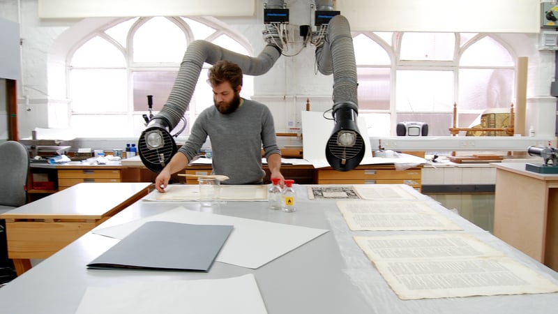 Alex Brooks consolidating the disbound leaves of a 16th century printed book using Klucel-G in isopropanol
