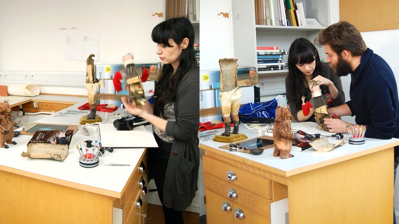 Alex Brooks and Brittany Cox figuring out a papier-mâché fill for a papier-mâché head on her automaton