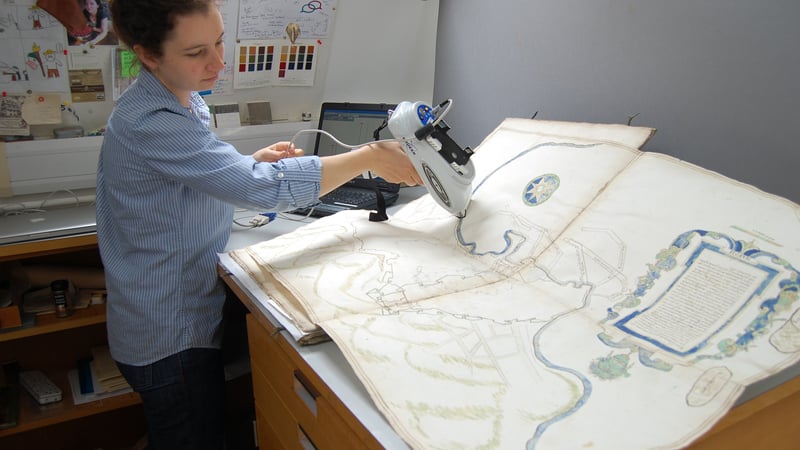 Abigail Uhteg analyzing the pigments on a 17th c. Italian manuscript using XRF spectroscopy
