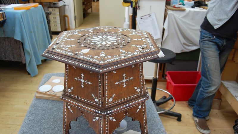 Ryo is working on casting fills with pigmented polyester and epoxy resins to repair the losses to the intricate ivory inlay in this table.