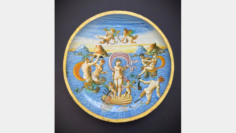 At this stage, the ceramic had been dismantled, and the rim cleaned. Previous conservation work on the rim included adding a butter yellow fill that was in keeping with similar Maiolica dishes at the time, but also adding an arch detail over the yellow that was incongruous with this style of ceramic. Therefore, I decided to remove the overpainted arches but retain the uniform yellow rim, to both respect the ceramic’s conservation history while aligning it with similar ceramics of the time.