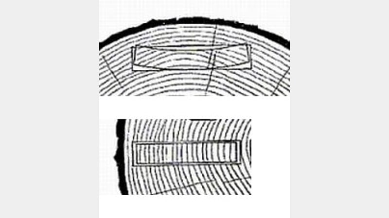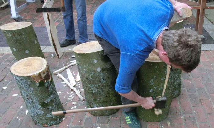 First the log was split into quarters using iron wedges and a sledge hammer. Wooden wedges or gluts may also be used to chase the split along the length of the log.