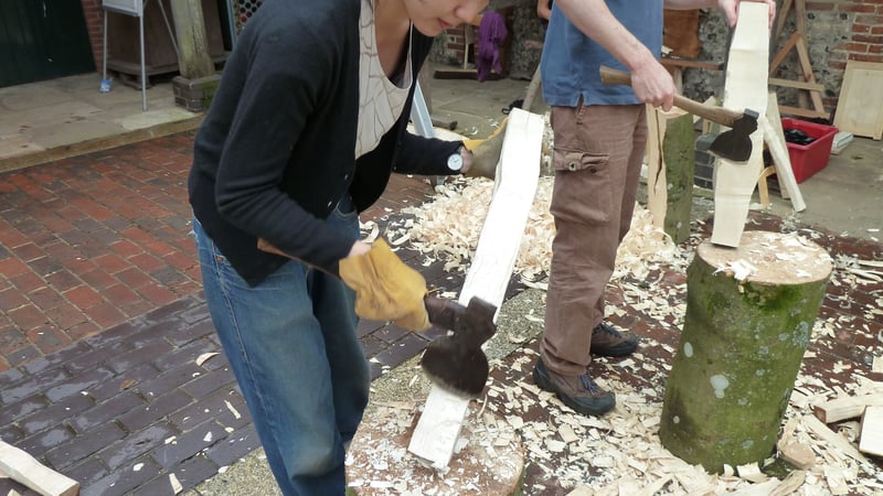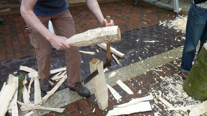 Rough dimensioning may be carried out with a hand axe. A series of angled cuts are made along the surface which can then be boosted out with a longer stroke. That way a rapid progress may be made.