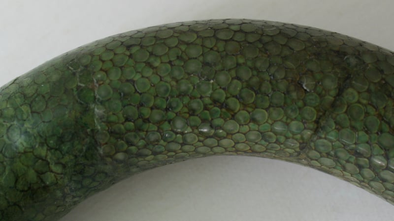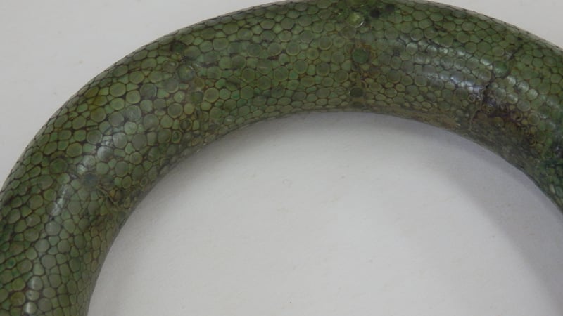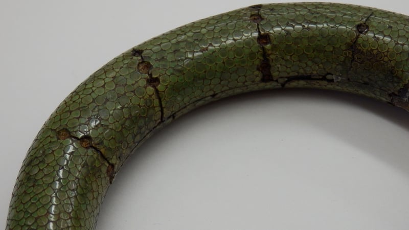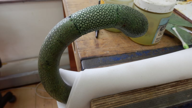 For the new section of handle, a real piece of shagreen was sourced. The trade in exotic skins is governed by The Convention of International Trade in Endangered Species. Shagreen falls into Appendix II which covers "species not necessarily threatened with extinction, but in which trade must be controlled". According to the regulations, skins must be imported into the EU accompanied by the export certificate issued by the government of the country of origin. It is therefore legal and relatively easy to source shagreen-it can even be bought from Ebay.