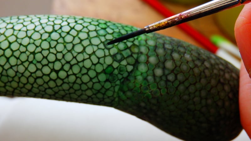In order to create a paler background and to allow the artificial scales to sit flush with the surface, the void was lined with Japanese tissue paper. The colour of the scale was then adjusted to the better match the surrounding scales both by painting the back of the scale and the Japanese tissue paper with watercolours and acrylics, before being glued in place using a spot of superglue. Although irreversible, the glue was being applied to the tissue paper, which, if necessary could be mechanically removed in the future. The artificial scale was then sanded and polished in situ to ensure it was flush with and of a similar sheen to surrounding scales. A stopping wax mixed to match the fill between the scales was rubbed into the area surrounding the scale.