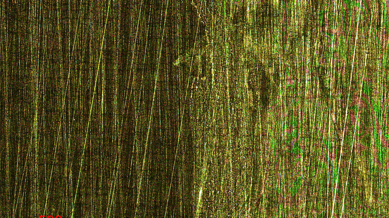 I've completed the first set of preliminary tests. A set of 6 samples was rubbed with garlic and the garlic juice was left to dry for about three minutes. Looking at the samples under the microscope seemed to show that the garlic was indeed etching the metal. The scratches in the surface that were made during polishing seemed to be getting deeper. Afterwards, however, when the surface was cleaned completely using acetone, the "etching" disappeared. What I thought might have been etching, turned out to simply be the residue of garlic reflecting the light differently. So the assumption that the garlic etches the metal surface appears to be wrong. The next step is to make absolutely sure that the garlic doesn't etch the surface by taking that testing to the extreme: rubbing the garlic on repeatedly until it can be said with certainty that etching will not happen.