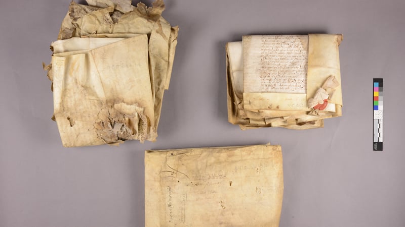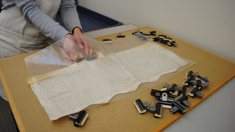 The documents had suffered from poor storage in the past: several leases at a time were tied together with a parchment strip, then were rolled up in bundles in the early 18th century, and left aside for years. A conservation project started to take care of the damaged parchment, which had become stiff, dirty and showed some losses. The purpose of the work was to clean the documents, flatten them and consolidate them in order to store them flat in archival boxes. This will allow an easier and safer handling of the leases, therefore providing a better access to research and study.