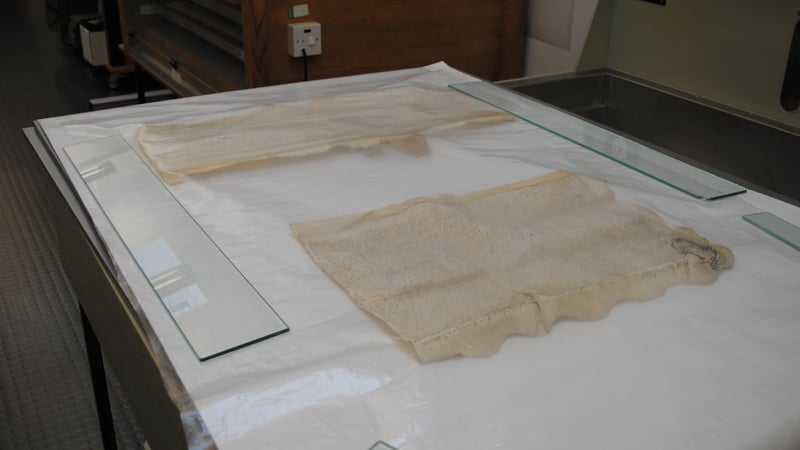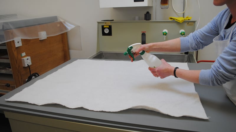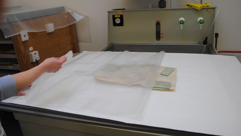 A sheet of Gore-Tex®, a material designed to be water-repellent but to let moisture vapour pass through it, is then placed on top of the capillary mat. This will allow moisture to relax the parchment, without water being in direct contact with the material.