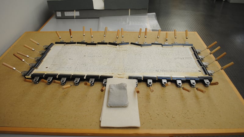 The same process had to be recreated in order to flatten the leases. For this, the relaxed document was quickly surrounded by bulldog clips on a pin board. The parchment is afterwards stretched gently on the board by securing the clips with metallic pins. The tension does not have to be too strong, but enough to maintain the parchment as flat as possible. The parchment can be left to dry under tension.