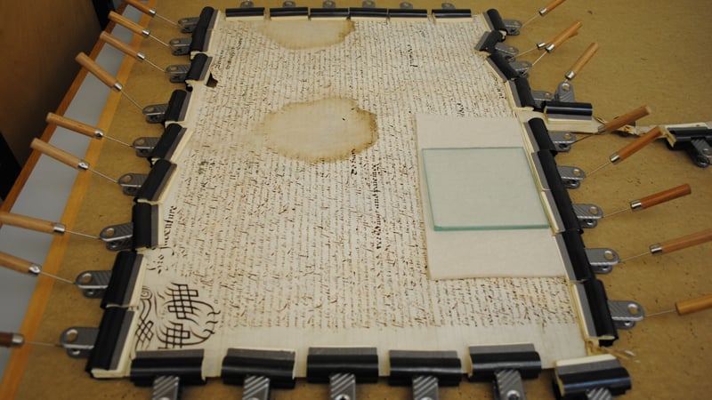 The document's condition is checked regularly, to assure that the humidity level does not exceed the necessary amount to relax the material.