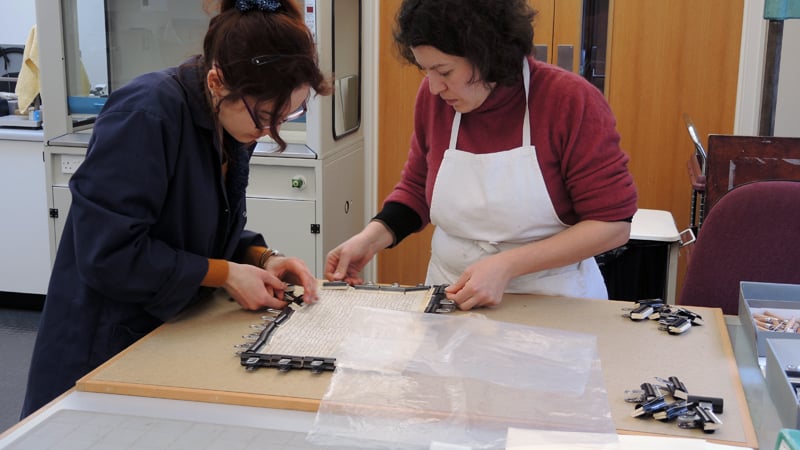 When nearly dried, the pins and clips were removed and the parchment was placed under blotting paper and left to fully dry under weight. The flattening was then completed and further consolidation of the support could be undertaken if necessary.