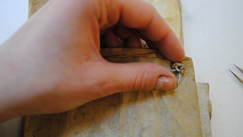 The first step consisted of removing the parchment strips that held the leases together. The thin strips were stiff and unwilling to move. To untwist them without breaking them, the parchment had to be gently worked by pushing and pulling to relax the material and release the knot.