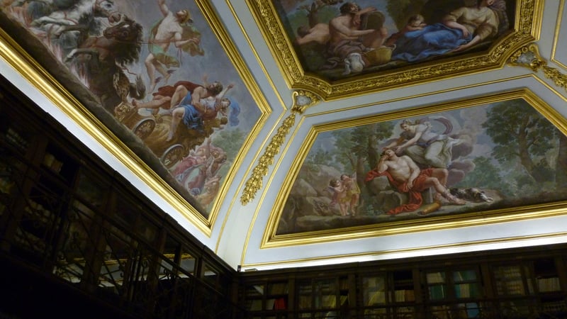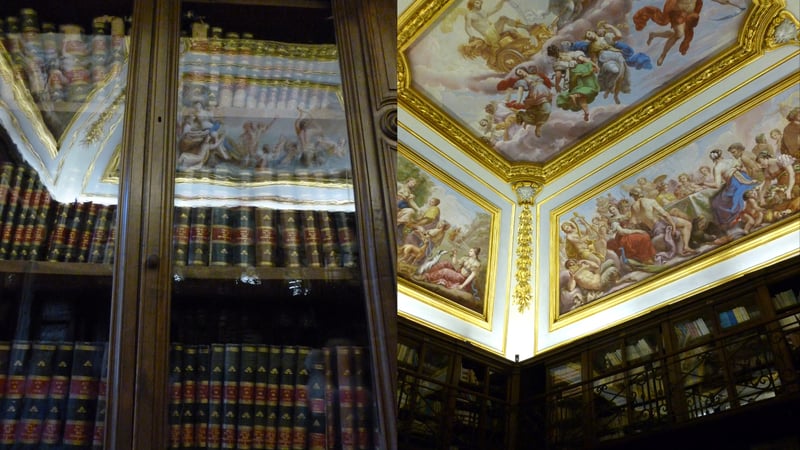 Above: the stunning reading room. Much of the older collection is on open display in a series of rooms with ornate ceiling decoration, with the books behind glass- or wire-paneled doors, and are preserved in the same format since the library was established in this building.