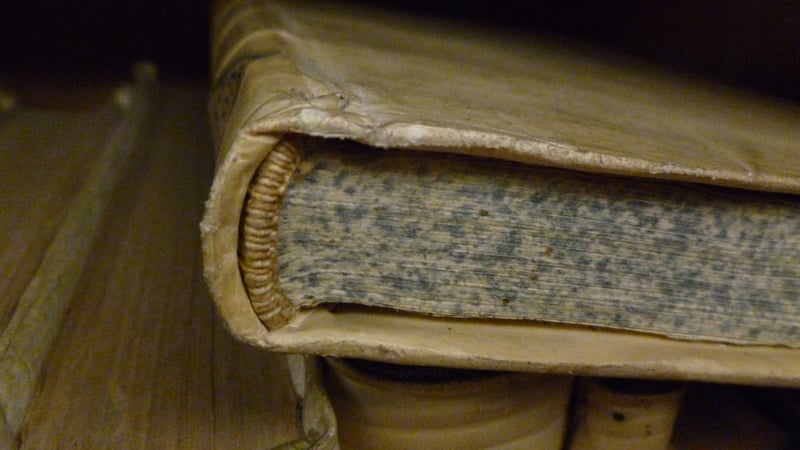 I hope the library will forgive me documenting the more damaged books, but these are sometimes the most interesting for us: losses in the covering let us see the skeleton of the structure, as in these parchment bindings above that were attacked by pests, or this calf binding below that lost the leather at the head from use. The area just under the headbands often reveals the original edge coloring, unaffected by light and dirt, and in this case it shows how the threads were worked in groups of three (see where the three pink threads get tied down over the spine)---that would normally be covered up by the leather.